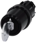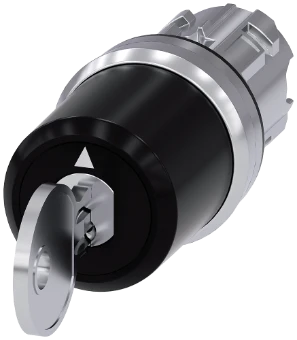 Siemens keyswitch, C, 22 mm, round, metal, shiny, lock number S-10-CG, with 2 keys, 3 switch positions IOII, momentary contact type on the left, latching on the right, actuating angle 2x45°, 10:30h/12h/13:30h, key removal O Key-operated switches SIRIUS ACT for meeting higher demands for access security. Under the brand name SIRIUS ACT, Siemens offers a unique portfolio of pushbuttons and signaling devices with global product approvals in three modern design lines of rugged genuine metal and high-grade plastic.An innovative snap-on concept makes the task of installing a unit so easy that it can be done with one hand and without any special tools. Groove-free holes are adequate as mounting holes since full twist prevention isalready integrated.Thanks to the high degree of protection throughout, the rugged devices are suitable for use in industry and outdoors. Even cleaning with a high-pressure jet is possible. Neither dust, oils, nor caustic solutions can interfere with reliable operation.As well as standard wiring, the devices can also be connected to the controller via PROFINET, AS-Interface or IO-Link. Doing so will help you to reduce wiring time and effort, minimize error sources and have more flexibility.The graphical Online Configurator provides convenient support when selecting and ordering individual devices, enclosures and labels. Extensive documentation (e.g. manual, 3D data, terminal diagram) is available. Versions available: Various locking systems (Siemens, C; Siemens, B; RONIS, OMR), 2/3 switch positions, latching/momentary-contact operation, various key removal positions. Note: Single device, please order holders and modules separately. SIRIUS ACT - Performance in action for control and signalling. Simply mounted, simply strong, simply perfect.