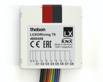 Impulsdrukkerinterface/binaire ingang voor 8 kanalen voor het Smart Home Systeem LUXORliving, potentiaalvrije ingangen, kabelaansluiting vierpolig, kunnen samen met conventionele impulsdrukkers/schakelaars in inbouwdozen worden gemonteerd, softwarefuncties: schakelen/impulsdrukker, dimmen, jaloezie, ingangen/uitgangen parametreerbaar, LED op uitgang aan te sluiten
