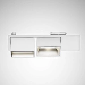 Spanningsrailspot met twee armatuurhoofden en dubbel asymmetrische stralingskarakteristiek. 110° zwenkbaar. Met CASAMBI-module voor integratie in een draadloos aan te sturen vermaasd netwerk met maximaal 250 deelnemers. Het systeem wordt in gebruik genomen met de app Casambi (iOS en Android). Bereik van de radiocommunicatiemodule bij ideale omstandigheden: 7,0 m. Het radiocommunicatiebereik kan variëren afhankelijk van omgevingsinvloeden (zoals wanden, plafond, vloer, machine, stalen balken, stroomleidingen). Door een extra radiocommunicatiemodule in te zetten als repeater kan het radiocommunicatiebereik vergroot worden. Bevestiging en elektrische aansluiting aan driefase-spanningsrail conform DIN EN 60570 door middel van driefase-spanningsrailadapter.. Voor de integratie in Global-spanningsrails van Nordic. Kapreflector met zacht uitlopende randen en hoge verblindingsbeperking in het armatuurhoofd van de spot geïntegreerd. Stralingskarakteristieken voor gangpadzoneverlichting. De lichtstroom en lichtkleur van het armatuur liggen vast. Armatuurlichtstroom 7380 lm, aansluitvermogen 78 W, Lichtkleur warm wit, kleurtemperatuur (CCT) 3100 K Brilliant Colour, algemene kleurweergave-index (CRI) Ra > 95. Kleurplaatstolerantie (initial MacAdam) ≤ 2 SDCM. Gemiddelde opgegeven levensduur L80 (tq 25 °C) = 50.000 h. Knipperen: Pst LM ≤ 1,0 bij volledige belasting. Stroboscoopeffect: SVM ≤ 0,4 bij volledige belasting. Armatuurbehuizing uit spuitgietaluminium. Oppervlak gepoederlakt met structuur. kleur wit, Armatuurafmetingen (L x B x H): 486 mm x 90 mm x 140 mm. Beschermcategorie (EN 61140): I, beschermklasse (DIN EN 60529): IP20. Toelaatbare omgevingstemperatuur (ta): 25 °C Gewicht: 2,7 kg. De driver is in de apparatenbehuizing geïntegreerd. De nominale bedrijfsspanning van de armatuur bedraagt 230 V, 50/60 Hz. Met Bluetooth Low Energy-hulpapparaat (BLE). De armatuur voldoet aan de fundamentele eisen van de van toepassing zijnde EU-richtlijnen en de productveiligheidswet. Ze is voorzien van een CE-markering.